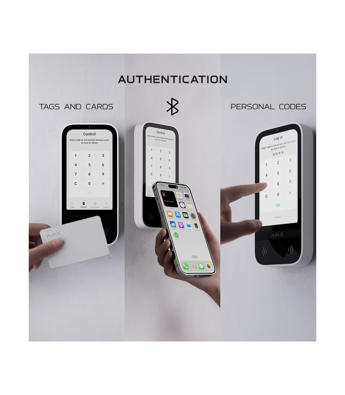 La sécurité des accès est totale, permettant l'authentification via smartphone par Bluetooth (BLE), par cartes et porte-clés haute sécurité DESFire®, ainsi que par codes d'accès (personnels, d'entreprise ou de contrainte).