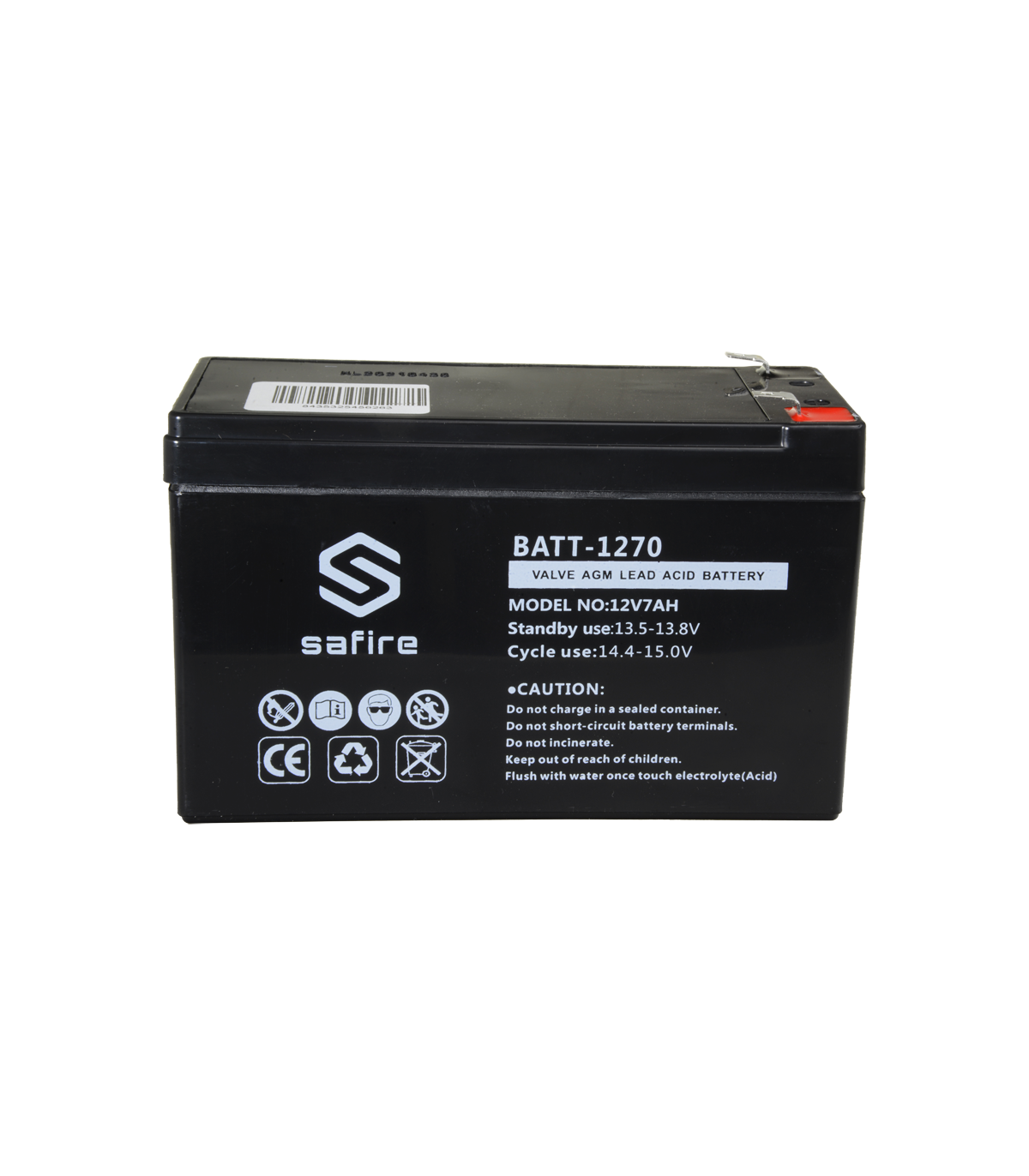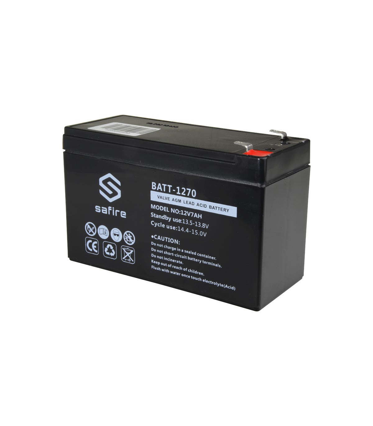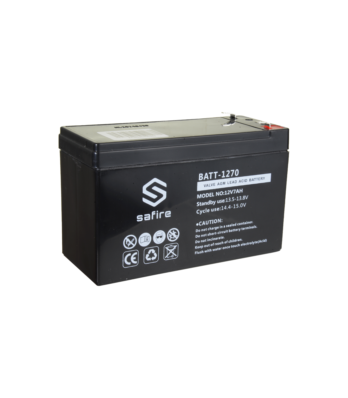Marque Safire Voltage nominal 12 V Capacité nominale 7.0 Ah (20HR) Usage standby 13.5 ~ 13.8 V L'utilisation cyclique 14.4 ~ 14.8 V Intensité initiale >2.1 A Intensité de décharge maximale 70 A max. Résistance interne 25 MΩ Type de connexion F1 Dimensions 93.5 (H) x 151 (L) x 65 (Pr) mm Poids 2100 g